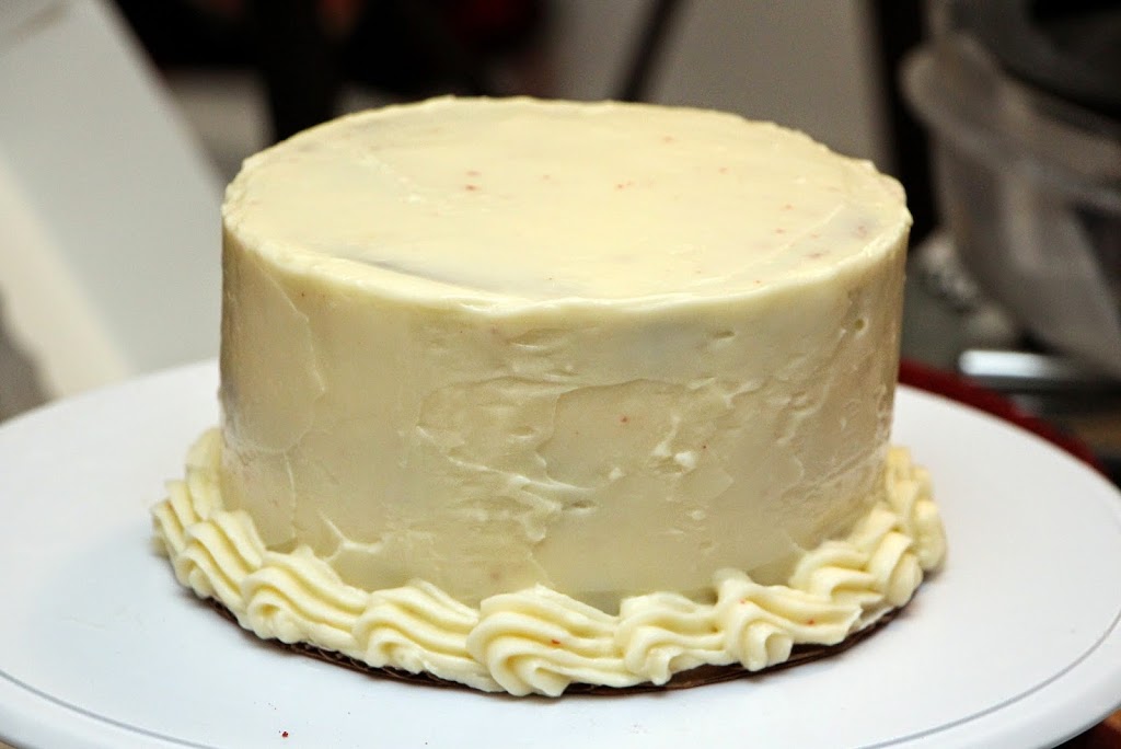 As a surprise, I also made a 6″ topper cake, which was alternating layers of red velvet cake and cheesecake, covered with cream cheese frosting. The idea was to use this either for the cutting ceremony, or for the couple to take home and freeze as a 1-year anniversary cake.